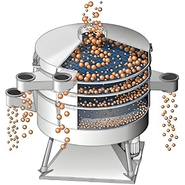 It uses a vibration motor to generate centrifugal force, making materials jump and spread evenly on the screen surface. Through multi-layer screen meshes of different apertures, materials are separated into various particle sizes, while impurities are retained on the top layer, completing the screening process.